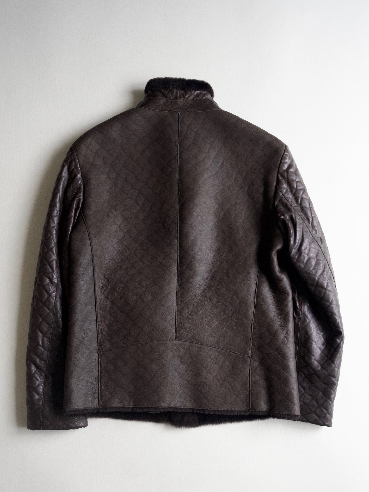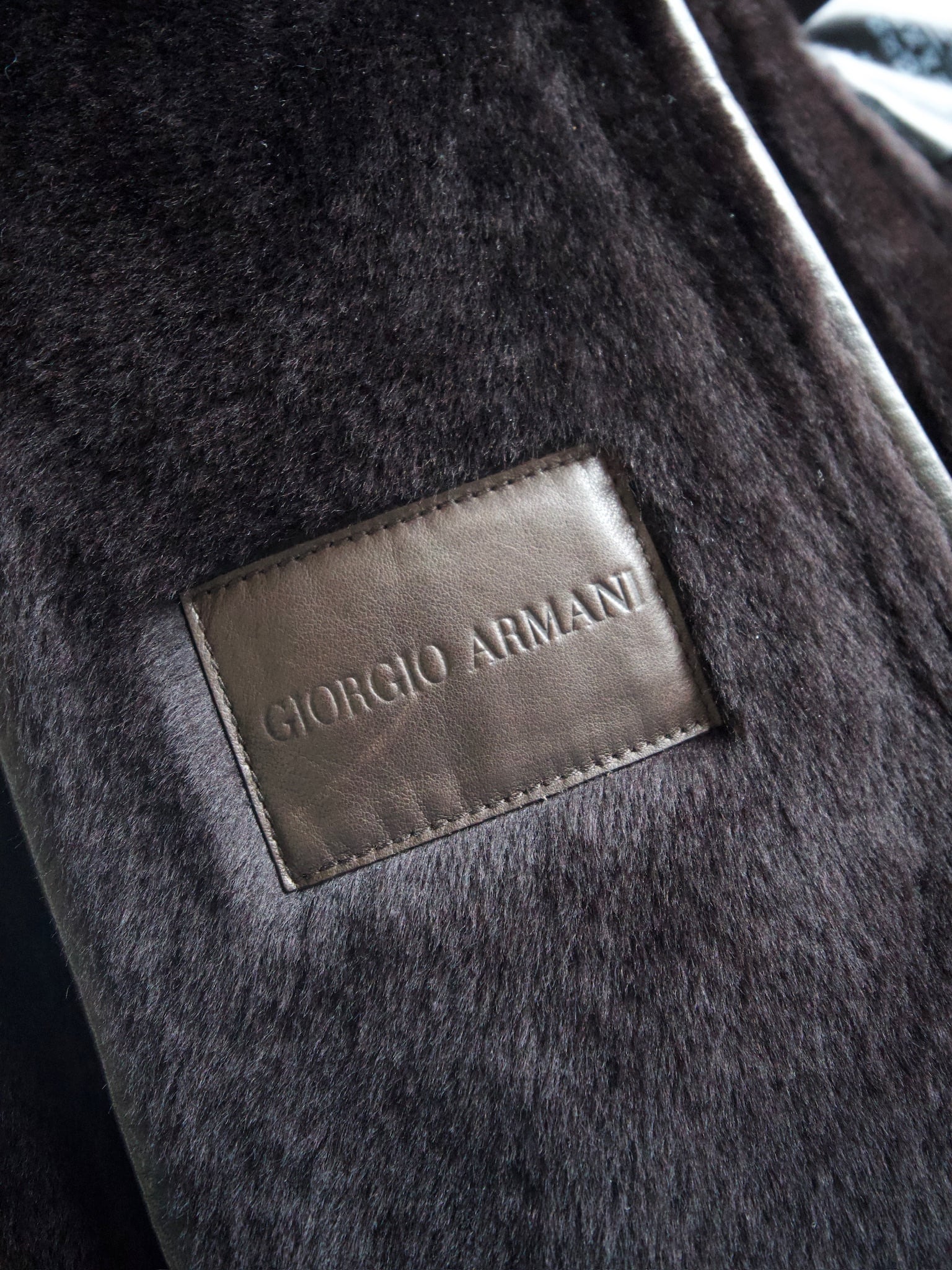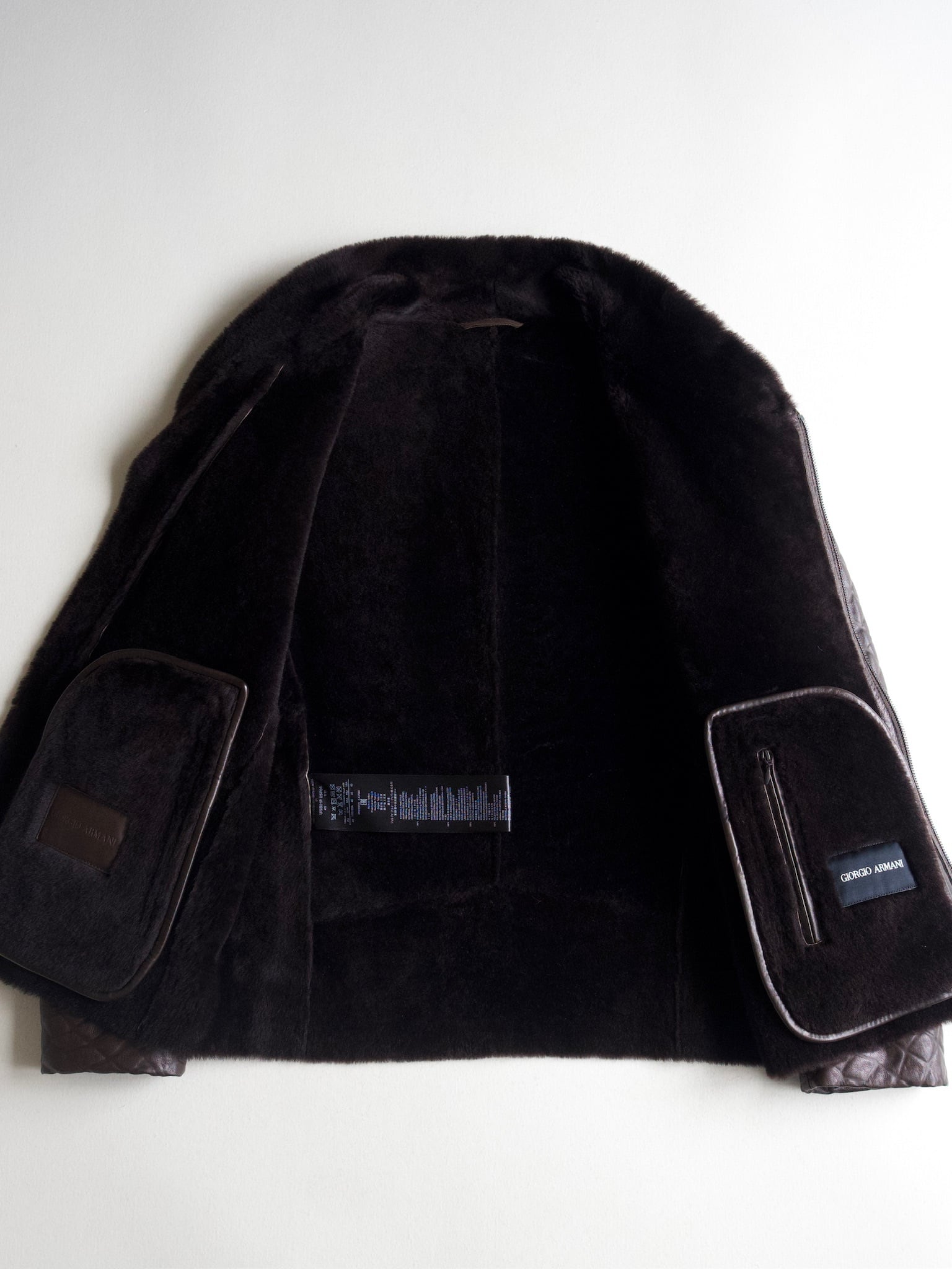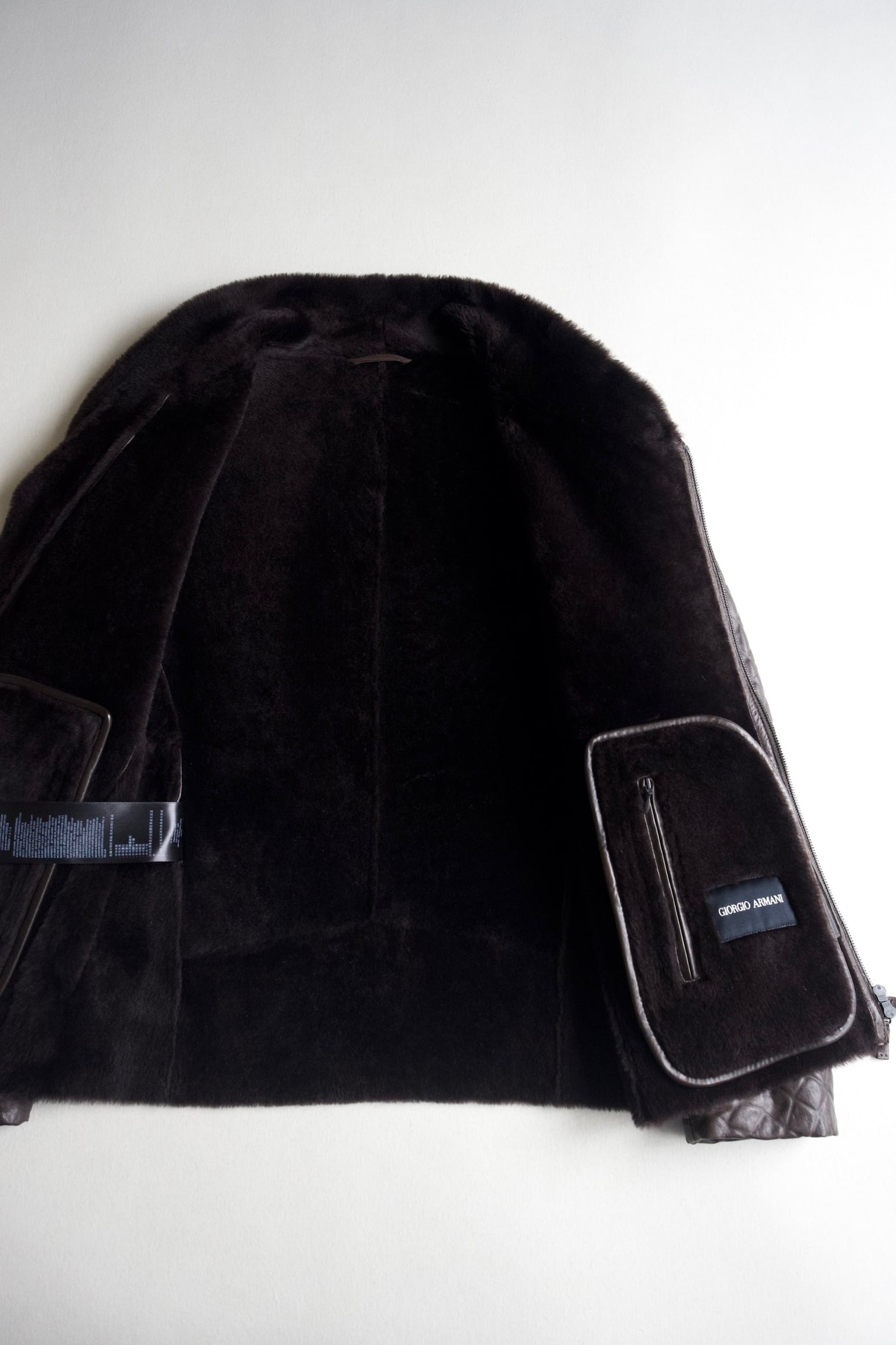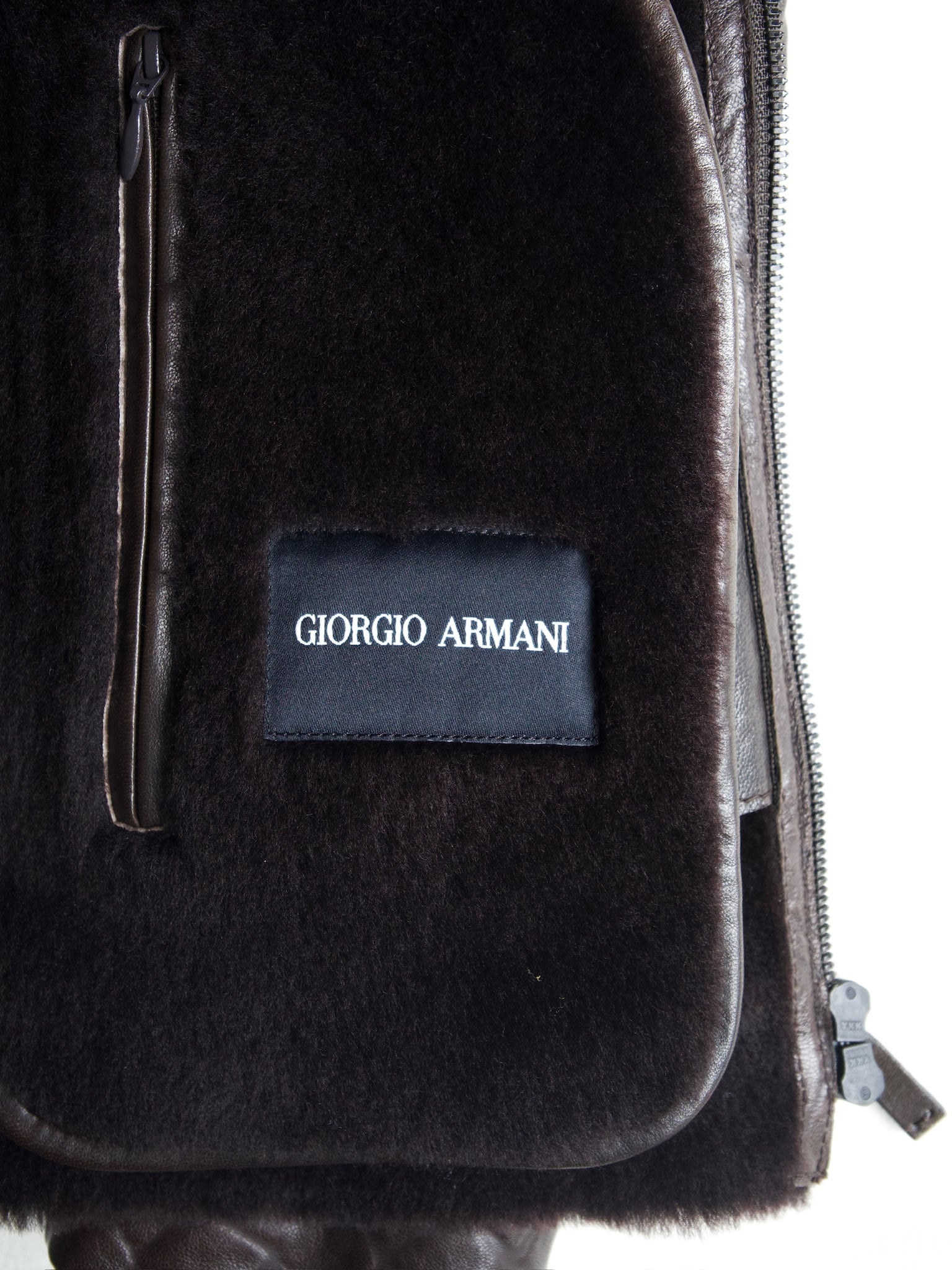 Covered with dense mouton fur up to the collar except for the sleeves, featuring an asymmetrical design typical of Armani.