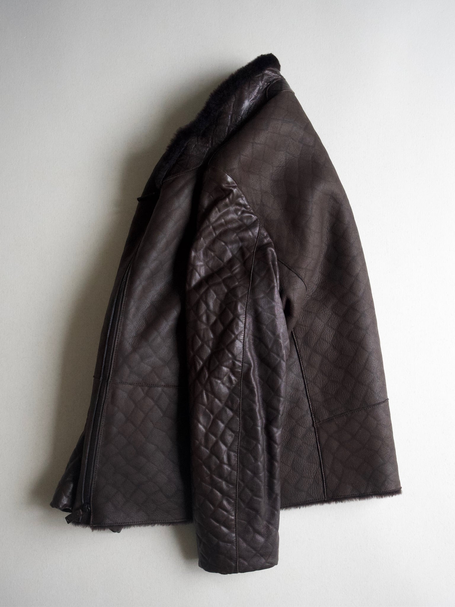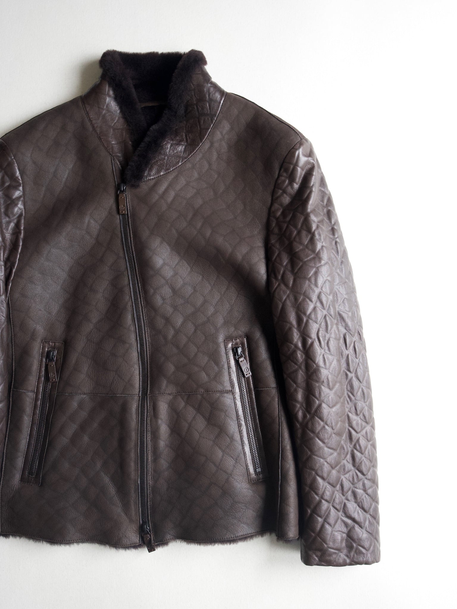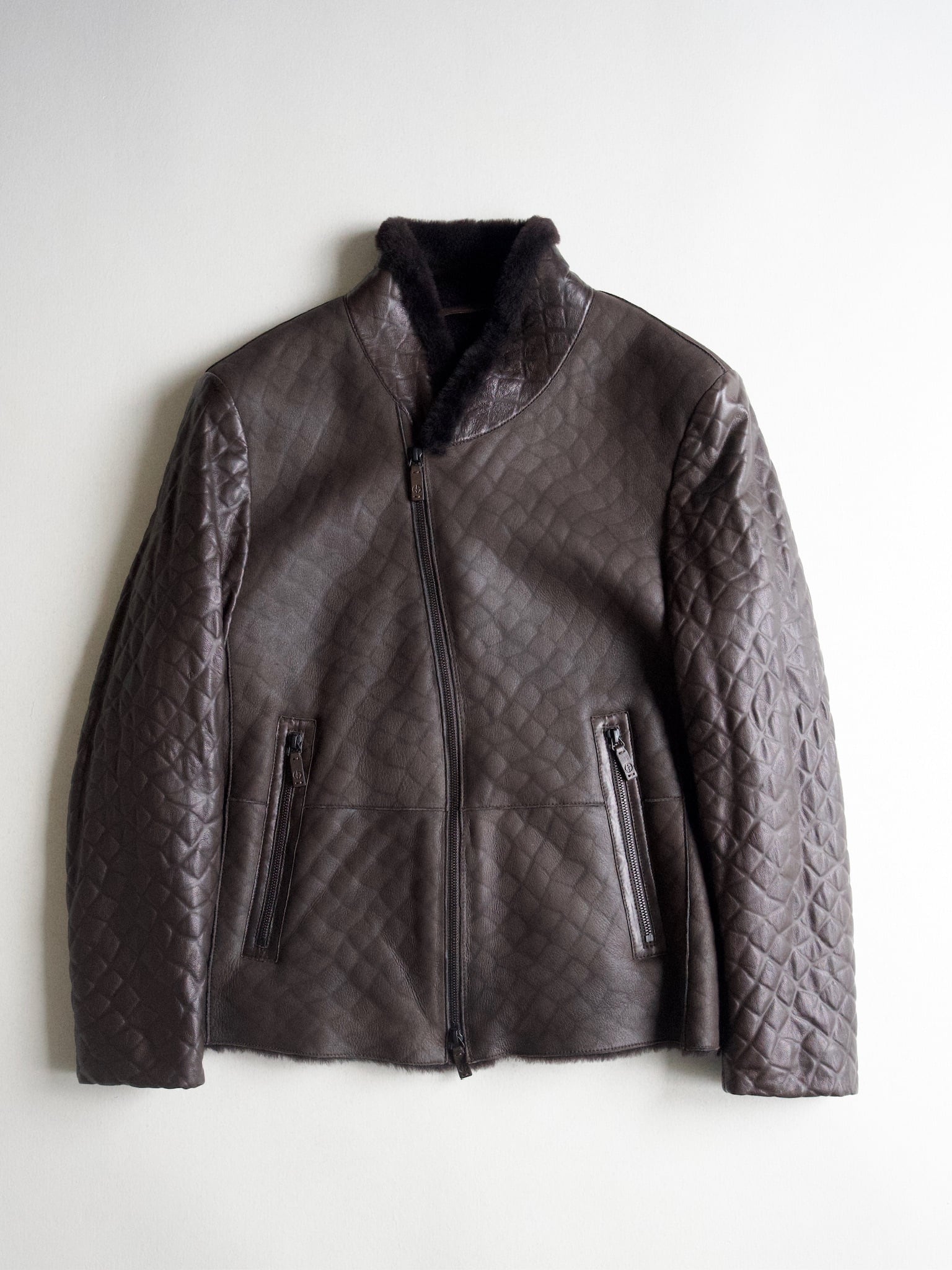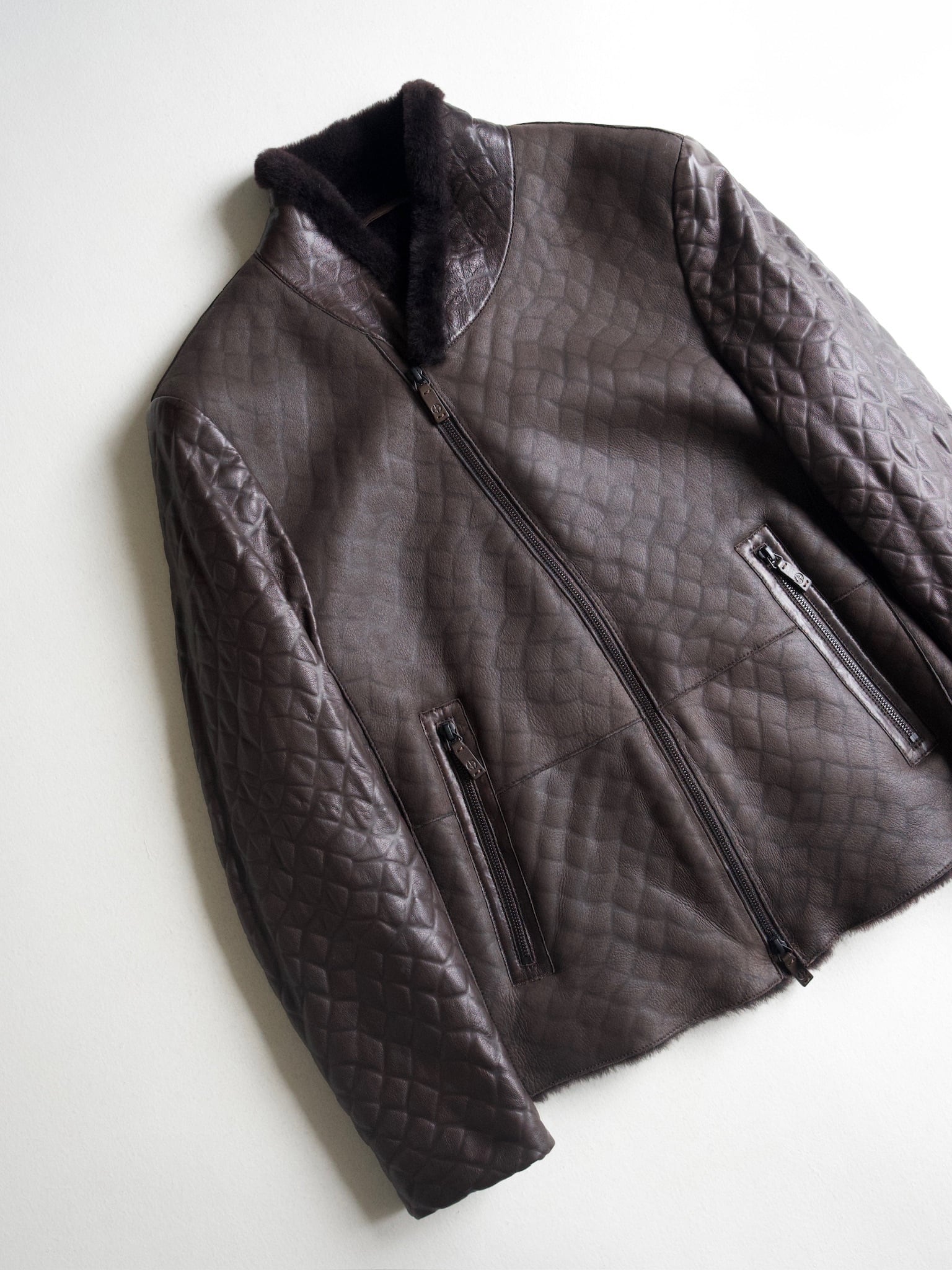 袖以外は襟までびっしりのムートンファで、アルマーニらしいアシンメトリーのレザージャケットです。