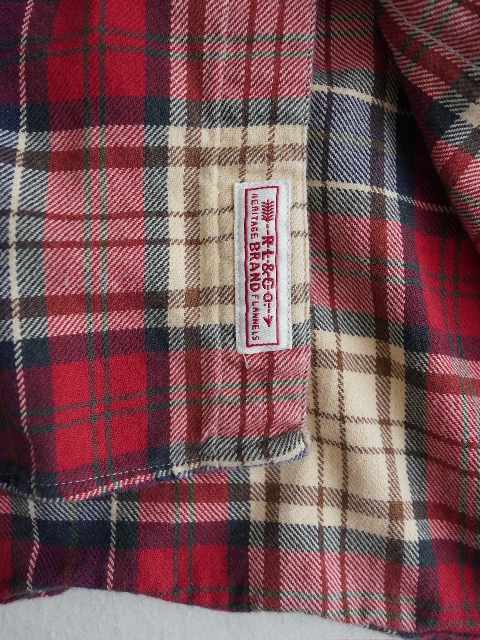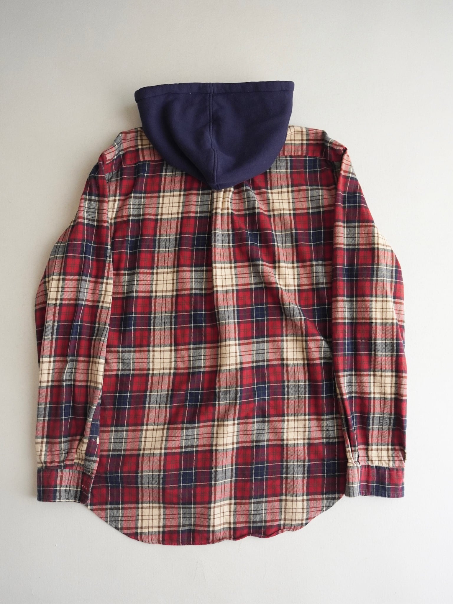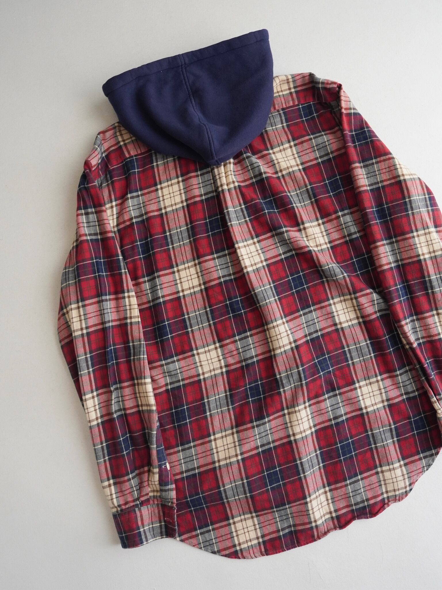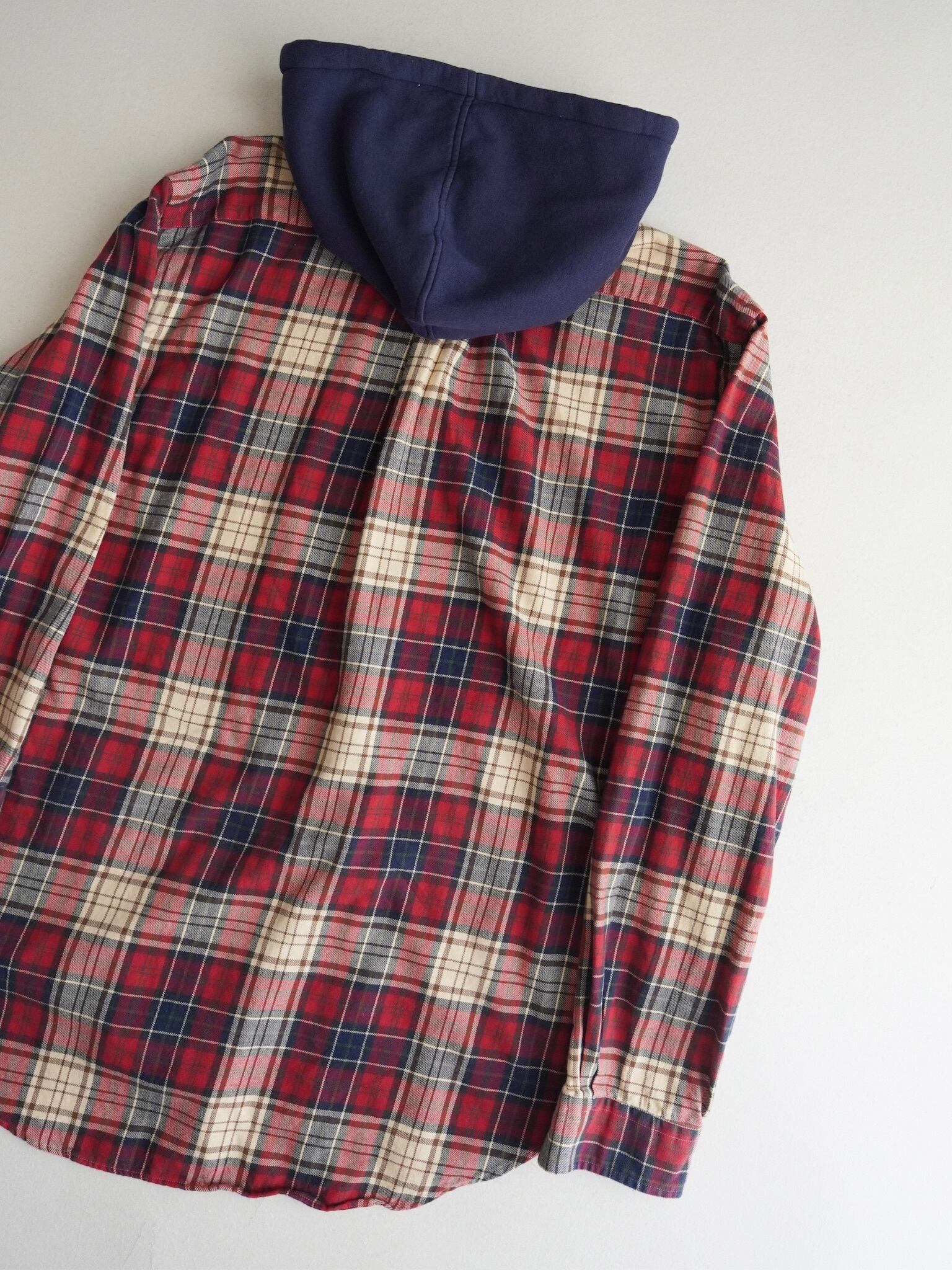 ノーカラーのネルシャツに裏地サーマルのスウェットフードが付いたデザイン。